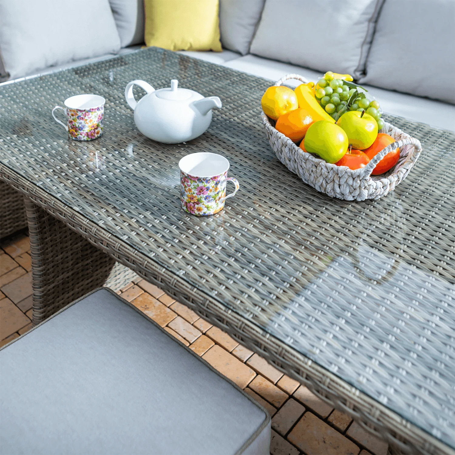 The set has traditional styling, featuring a double curve weave in a natural beech shade, and cushions in a complimentary dove colourway. The cushions are hard wearing as well as soft to the touch. They feature Weatherready fabric technology that is season-proof – they can be left outside all summer season without worry.
