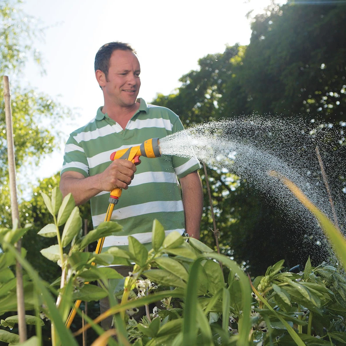 Multi-purpose Hose Gun with a choice of jet, cone, fast-fill, fan, mist, and metal rose spray patterns.
