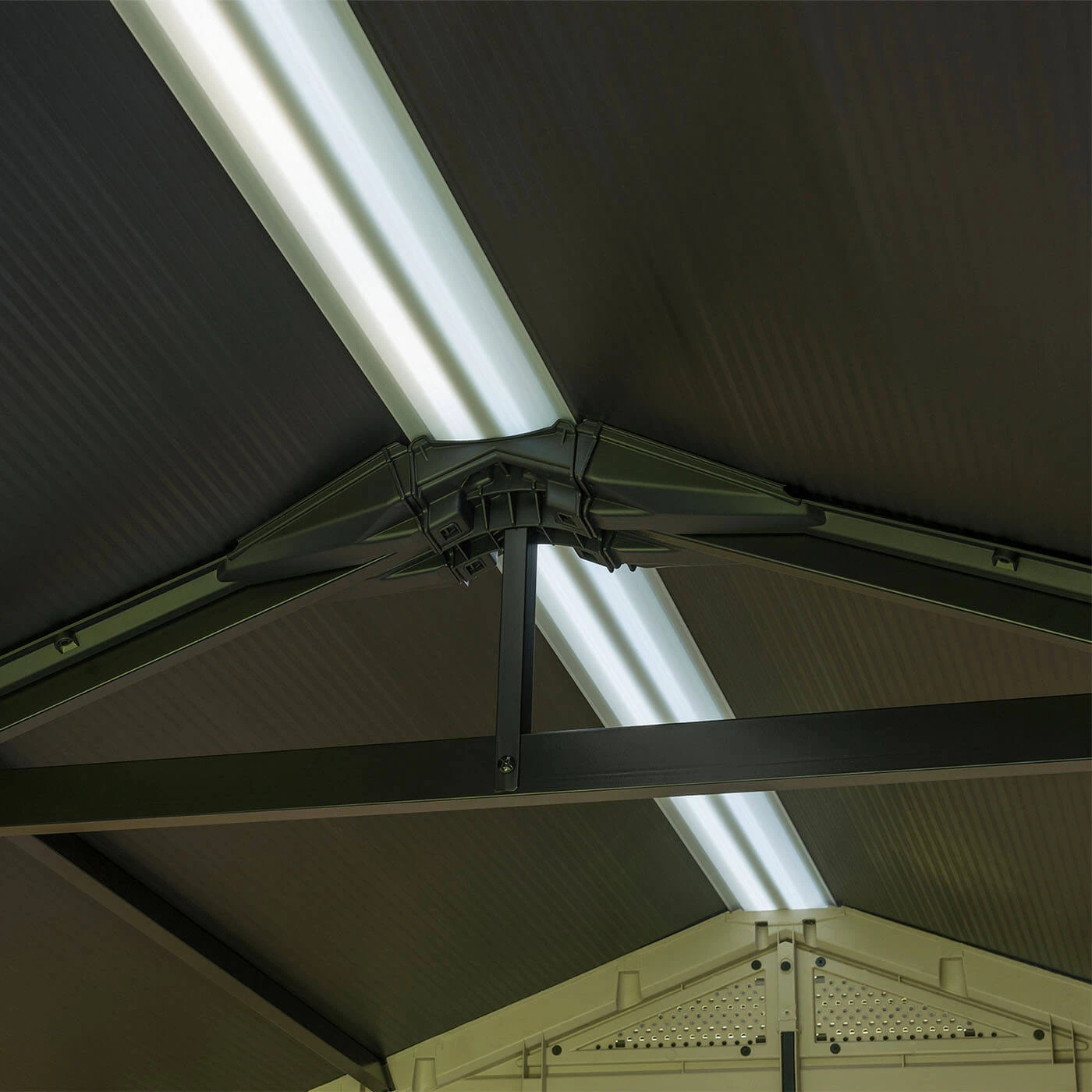 This elegant outdoor garden shed makes storing just about anything simple and elegant. The Keter 8 x 11 large apex resin shed is made out of a durable and weather-resistant resin that has a fine wood-like texture for looks and incorporates steel reinforcement for sturdiness.