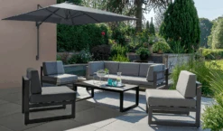 The wind-up mechanism makes it effortless to open and close the canopy, which is made with a lightweight and durable polyester. It is fully adjustable and can tilt vertically to completely cover the furniture from the sun. The hard-wearing canopy offers UV50+ sun protection and is shower resistant.