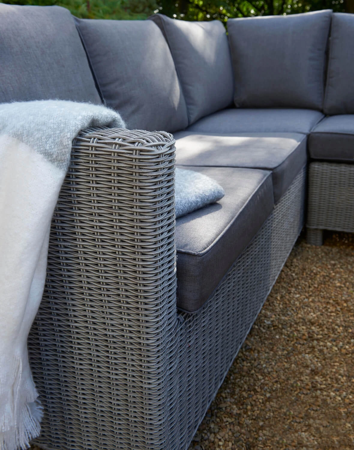 Made with 5mm half-round synthetic wicker, which has been woven onto a robust aluminium frame, this set is able to be left out all year round (excluding cushions). It has additional support along the corner sofa to increase the sets overall sturdiness. With a 5cm foam core in the seat cushions and double-piping in the back cushions, this set is luxuriously comfortable and somewhere you will love to spend time.
