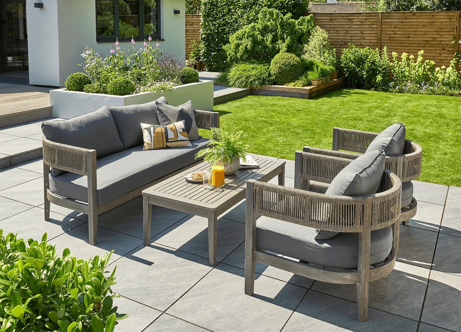 Make the most of your garden by creating a cosy, natural corner with the Arden Lounge Sofa Set. Made from Acacia wood with rope detailing and topped with thick, comfortable cushions, it’s the perfect set for gathering with friends or family.